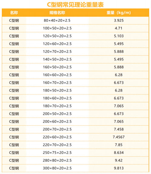舉例:C100*50*20*2.5的理論重量=(100+50*2+20*2)*2.5*0.00785=4.71KG/M