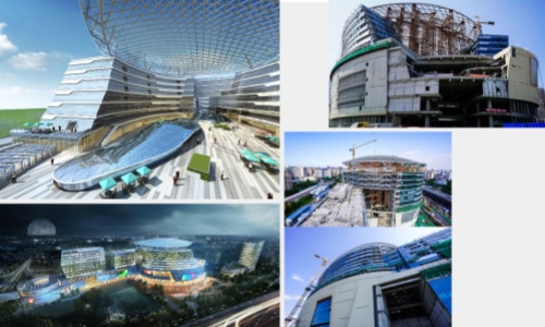項目緊鄰蘋果園交通樞紐,共分三期建造施工,一期、二期兩棟配樓樓外墻面和玻璃幕墻都已經(jīng)安裝完畢,三期部分結(jié)構(gòu)封頂,剩余部分正抓緊時間趕工,建筑面積20余萬平方米,占地面積55000平米。